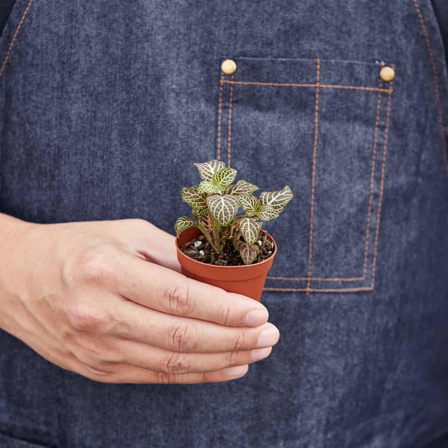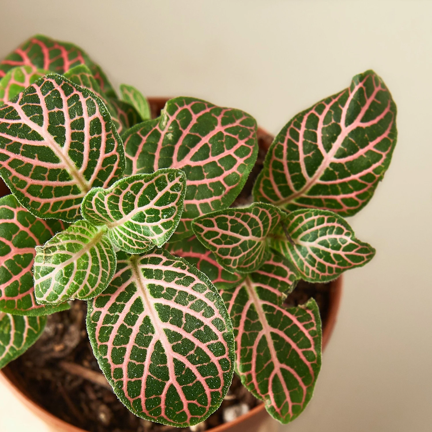 - Description: The Fittionia is a spreading evergreen perennial with delicately veined, deep-green leaves. Although the most popular vein color is silvery-white, you can also readily find varieties with veins in red, pink, white, and green. Small buds may appear after a time where the stem splits into leaves. Flowers are small with a white to off-white color.