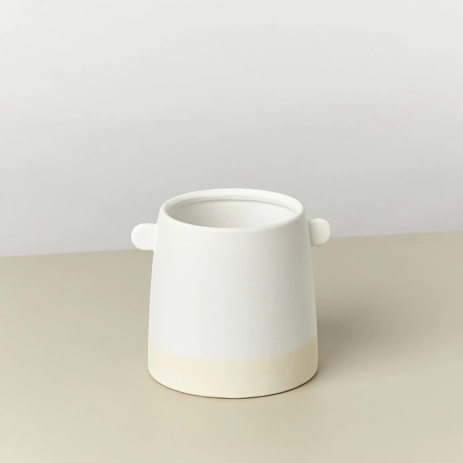 The Knob Cylinder Pot is a simple yet stylish ceramic piece featuring two knobs at the top of the pot.